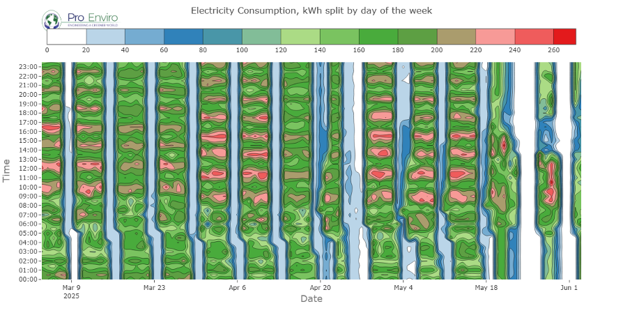 Pro Enviro and Shropshire Wholesale Meat have worked together to develop a range of net-zero and renewable energy projects as part of its long-term sustainability strategy aiming to reduce greenhouse gas emissions. The project began with baseline monitoring and a macro level energy analysis, including a half hourly data analysis. The data has been mapped through multiple graphs and charts, especially the three-dimensional consumption graphs called Envirotracks. A sample of the data has been shown below, it shows Shropshire Wholesale Meat’s electrical consumption per half hour of the day for one quarter of the year. This data can be utilised to assess baseload capacity, unproductive load and average electrical demand.
