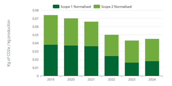 These improvements in energy efficiency have also produced direct financial savings of approximately £52,000. In addition to these direct savings, the company has benefited from indirect gains through improved operational efficiency, enabling more products to be manufactured using the same amount of electrical energy. This improvement in productivity is reflected in the normalised Scope 1 and Scope 2 emissions data, which shows a lower level of emissions per unit of production.